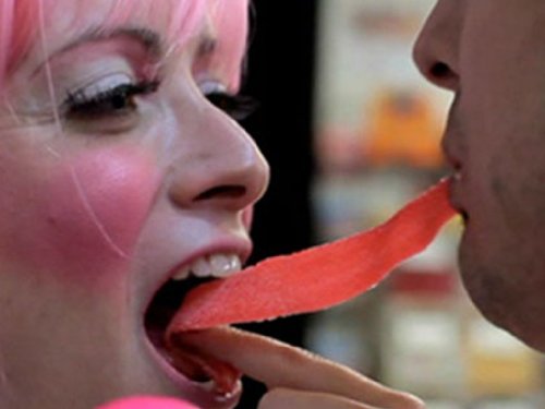一個怪怪濃妝妹跟胖胖男主談戀愛時,一直餵食她男友甜食